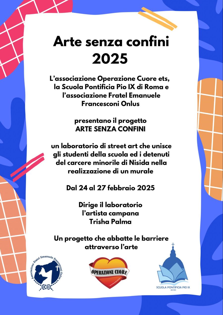 L’Associazione Operazione Cuore E.T.S., la Scuola Pontificia Pio IX di Roma e l’Associazione Fratel Emanuele Francesconi Onlus presentano un laboratorio di street art per la realizzazione di un murale presso il carcere minorile di Nisida, dal 24 al 27 febbraio 2025.