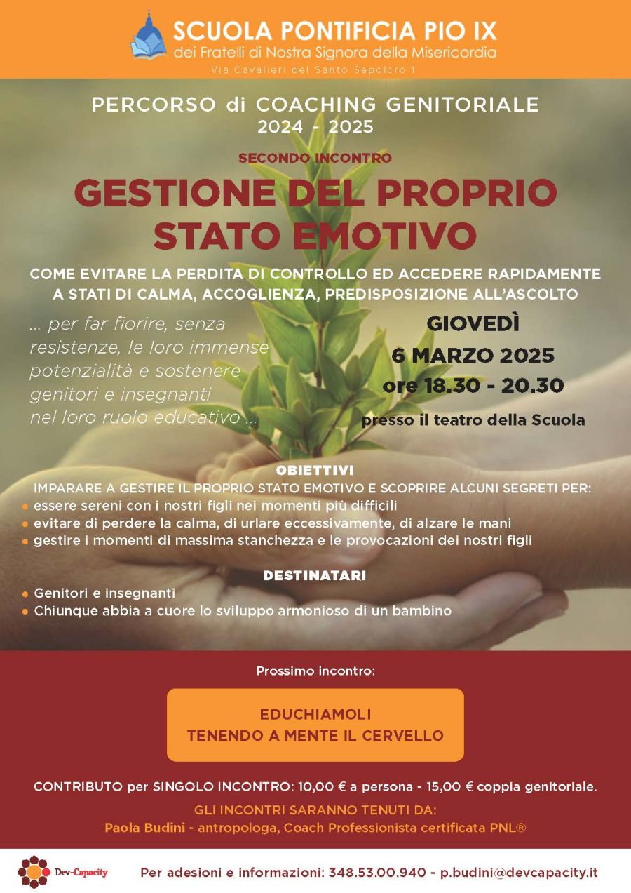 ricordiamo GIOVEDI' 6 MARZO h 18.30\20.30 l'incontro di Coaching Genitoriale dedicato alla 'Gestione del Proprio Stato Emotivo' presso il Teatro della Scuola.