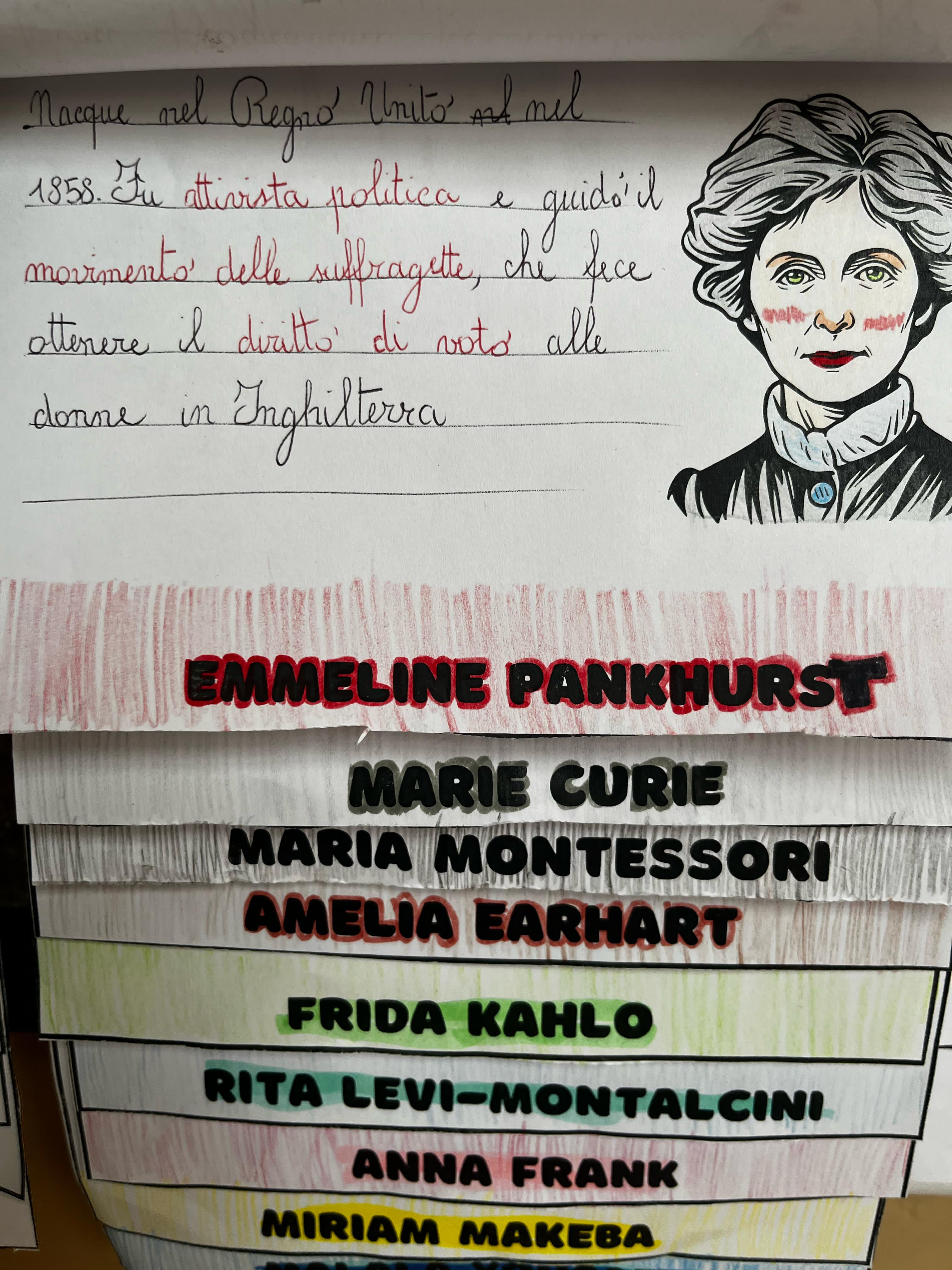 L’8 marzo si è celebrata la Giornata Internazionale dei Diritti delle Donne. Gli alunni di quarta primaria hanno avuto l’opportunità di conoscere la vita, le battaglie e le conquiste di dodici donne straordinarie, che con coraggio e determinazione hanno cambiato il corso della storia. Ipazia, Frida, Malala, Artemisia, Emmeline… Ogni nome racconta una storia di ribellione e rivoluzione, di impegno e speranza. I bambini le hanno scoperte, ammirate e, a loro modo, ringraziate per l'eredità di libertà e diritti che ci hanno lasciato.